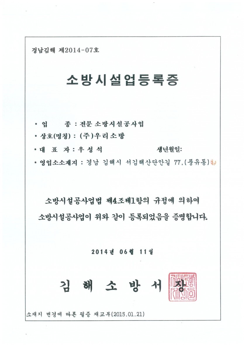 소방시설업등록증(공사업) 페이지 정보 작성자 최고관리자 댓글 댓글 0건 조회Hit 70회 작성일Date 25-06-19 17:41 본문 소방시설업등록증(공사업) 목록 다음글소방시설관리업 등록증 25.05.26 댓글 0 댓글목록 등록된 댓글이 없습니다.